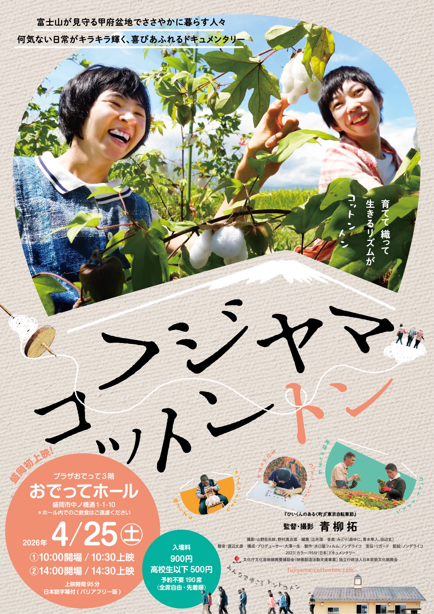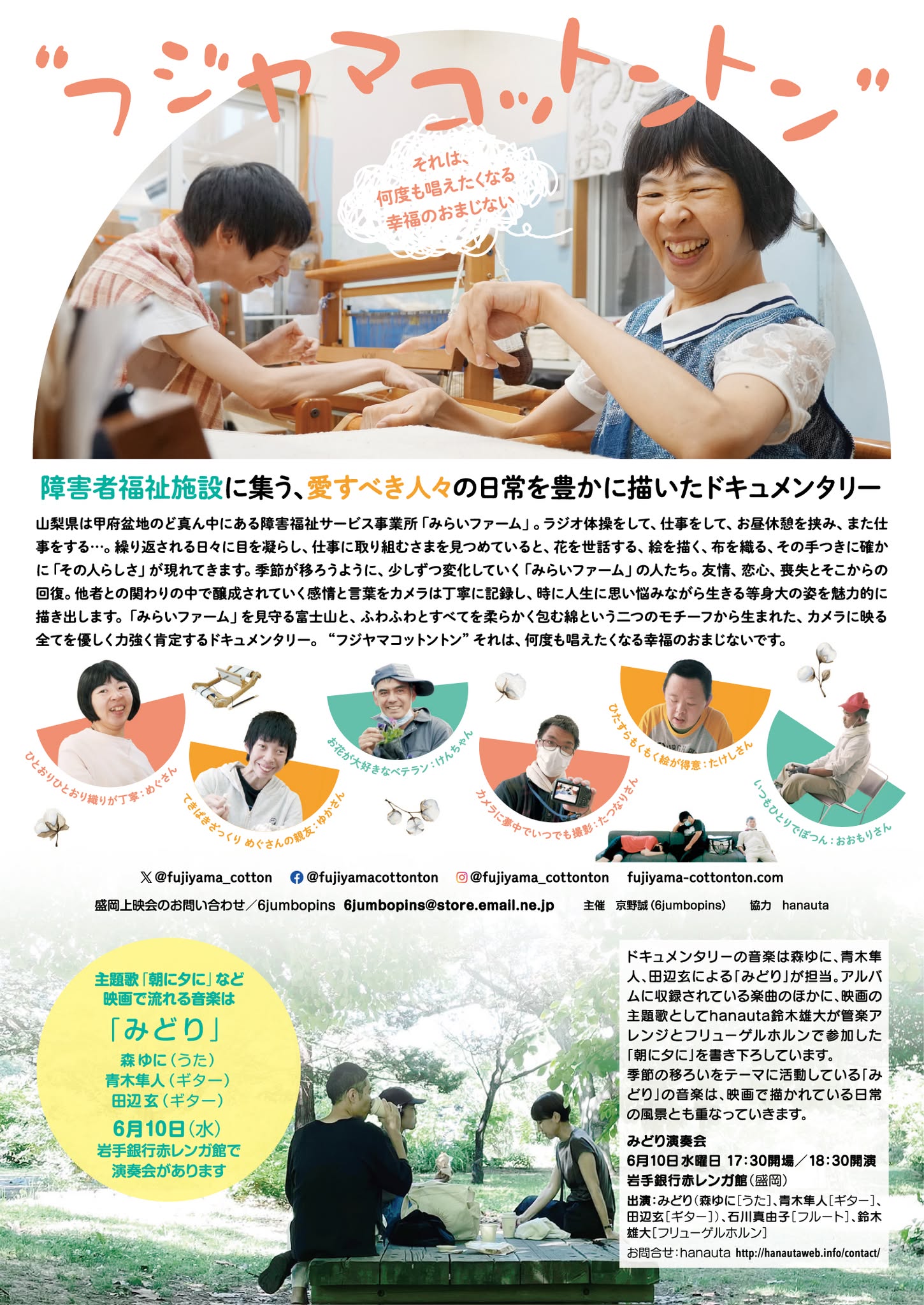 山梨県は甲府盆地のど真ん中にある障害福祉サービス事業所「みらいファーム」。ラジオ体操をして、仕事をして、お昼休憩を挟み、また仕事をする….。繰り返される日々に目を凝らし、仕事に取り組むさまを見つめていると、花を世話する、絵を描く、布を織る、その手つきに確かに「その人らしさ」が現れてきます。季節が移ろうように、少しずつ変化していく「みらいファーム」の人たち。友情、恋心、喪失とそこからの回復。他者との関わりの中で醸成されていく感情と言葉をカメラは丁寧に記録し、時に人生に思い悩みながら生きる等身大の姿を魅力的に描き出します。「みらいファーム」を見守る富士山と、ふわふわとすべてを柔らかく包む綿という二つのモチーフから生まれた、カメラに映る全てを優しく力強く肯定するドキュメンタリー。<フジャマコットントン>それは、何度も唱えたくなる幸福のおまじないです。